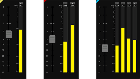 Examples of different fader groups: mono, stereo or 4-channel. These can be expanded to 32 channels.