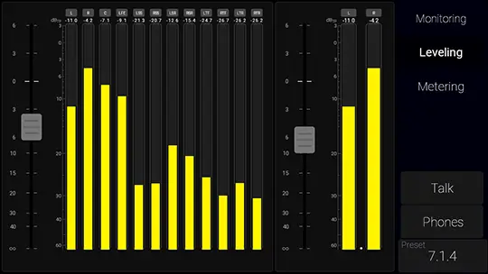 Faders can be based on any of the support channel formats. Here you see a 7.1.4 and a stereo.
