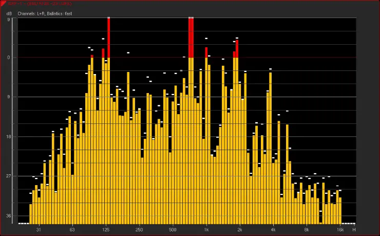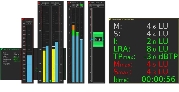 - Bargraphs for summed Loudness with Momentary, Shortterm, Integrated values, and Loudness Range (LRA)