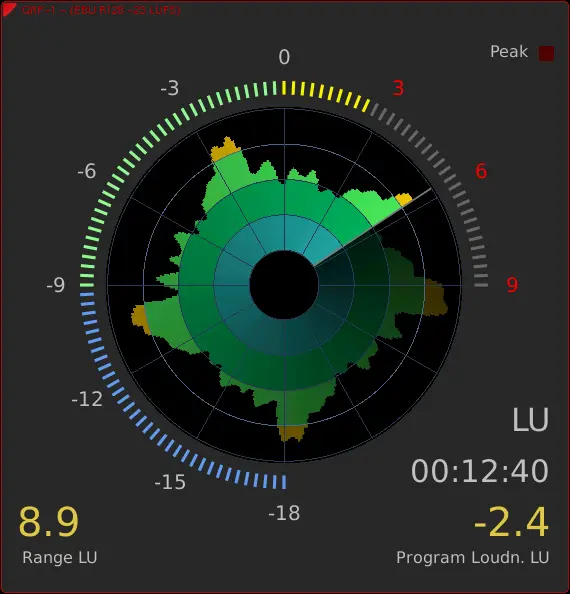 The radar is complemented by a true-peak warning and by two descriptors to characterize the entire loudness ‘landscape’ of a program, film or music track precisely. By default, the numbers displayed are program loudness and loudness range.