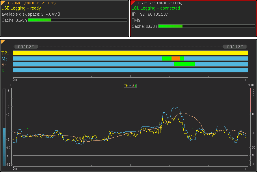 The Logging instrument collects data of Loudness and TruePeak measurements of up to two audio groups of a preset and allows you to store it on a USB flash drive or to send it via IP connection to the free LQL - Loudness Quality Logger PC software for analyzing.