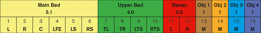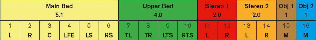 There will be two immersive channel layouts at play. Both are based on a traditional 5.1.4 main- and upper bed layout, but they differ with regards to stereo channels and the number of objects.
