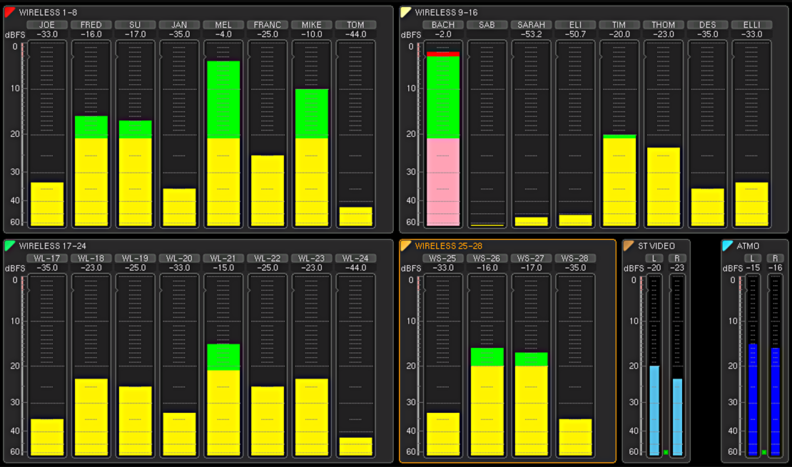 The TouchMonitor would typically be set up to monitor 16 or 32 audio channels, and in most cases a simple configuration of lines of PPM meters is sufficient.