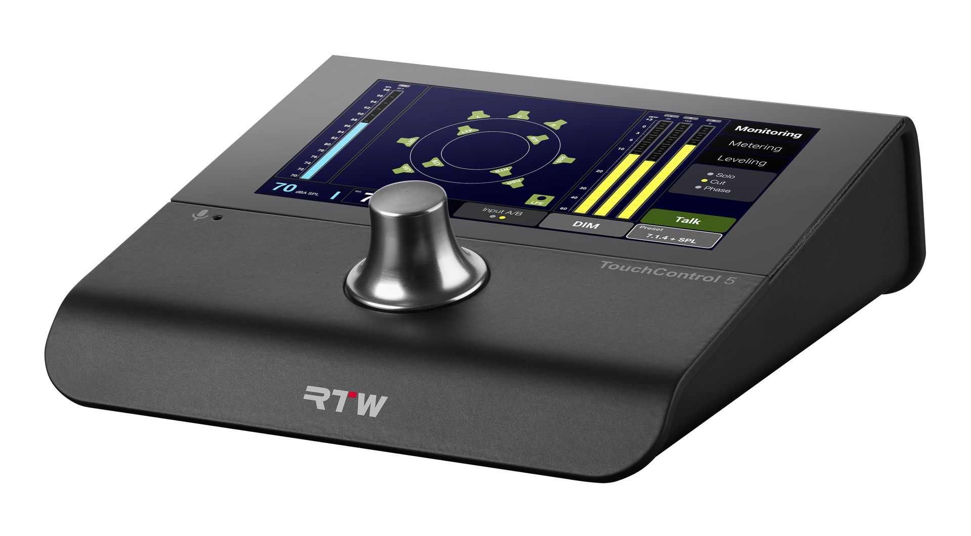 TouchControl 5 is a monitor controller and audio meter with an intuitive user interface and a small footprint that preserves valuable desktop real estate, featuring a 5” touchscreen, as well as a rotary knob that also functions as a push button for easy access to dim or mute functions. The screen layout can effortlessly be customized by the user via a browser-based application, and TouchControl 5 is able to control up to 32 AoIP audio channels, making it compatible with audio formats from mono to immersive within a Dante® audio network.