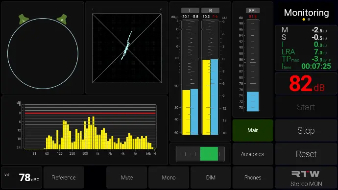 Monitor Control for a Stereo speaker setup with SPL, PPM, Correlator, RTA, Vectorscope and Loudness metering.