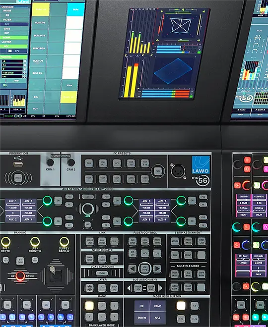 LAWO customers can enjoy pristine RTW Metering in the mc² broadcast consoles. This one is the mc²96 flagship, but it is also integrated with other Lawo consoles. Hands on your faders. Eyes on your audio!
