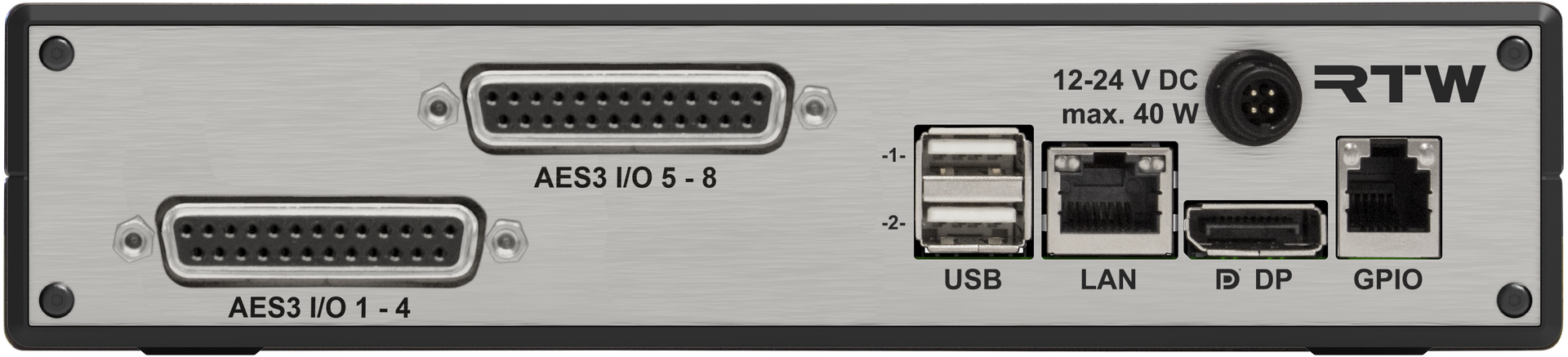 - 8 digital inputs + 8 digital outputs (4 x AES3 In, 4 x AES3 Out, D-Sub)