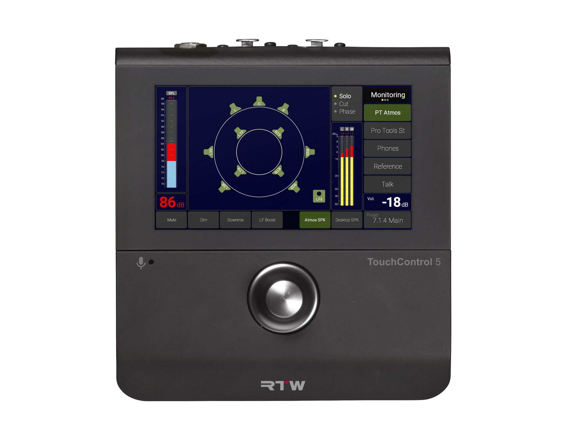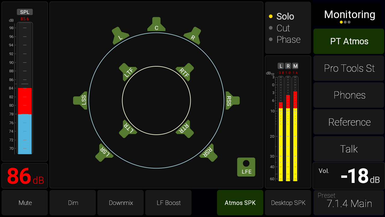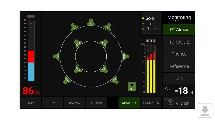 The list is long, but let’s emphasize downmix, DSP-powered speaker calibration (using the internal microphone OR manual set), SPL readout, 4 input sources, speaker set selection (up to 4), solo, cut, swap, phase, mono, dim, mute and test tone generator.