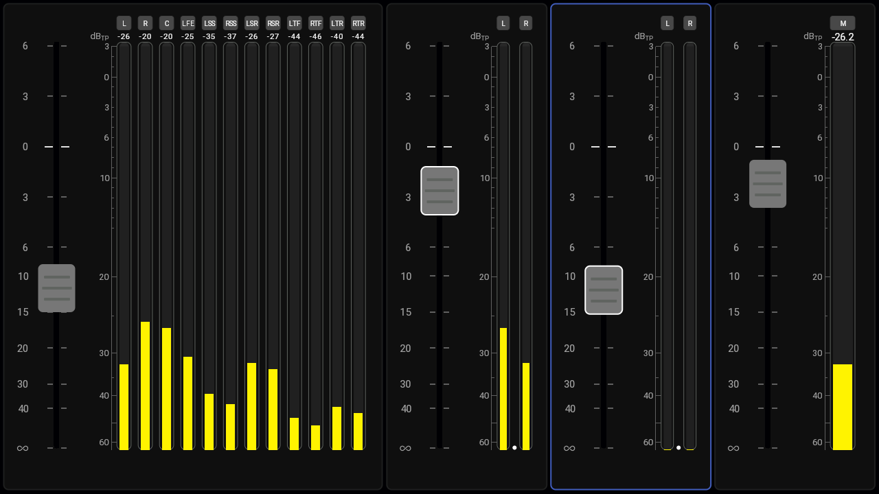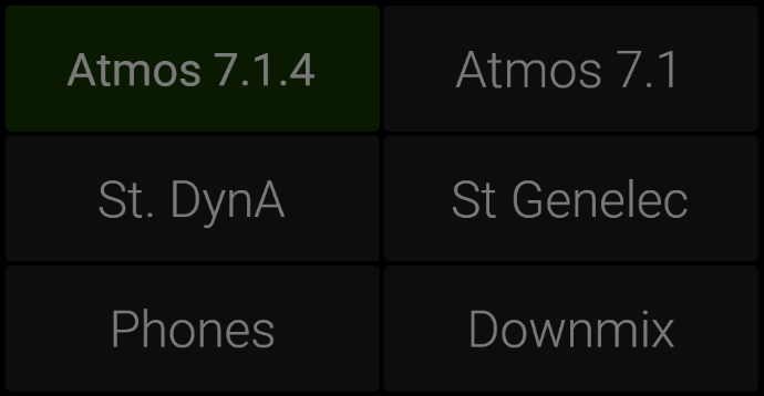 Faders can be based on any of the support channel formats. Here you see a 7.1.4 and a stereo.