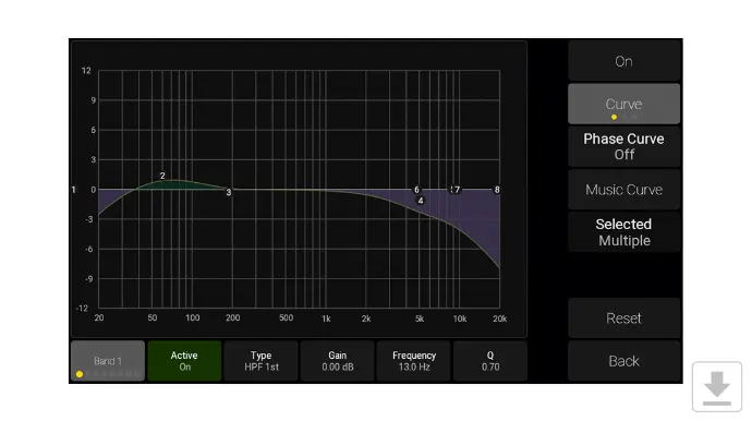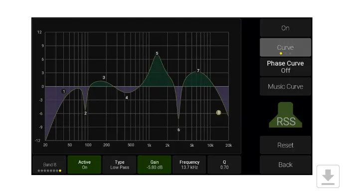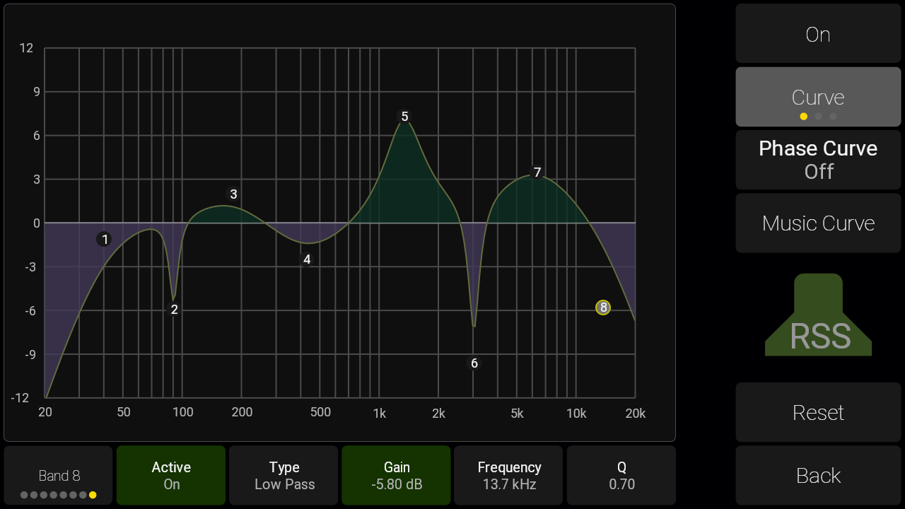 Each speaker has a DSP section for ultimate control. You can set individual delay, gain and phase, and a 8-band EQ is available for each speaker in your setup.