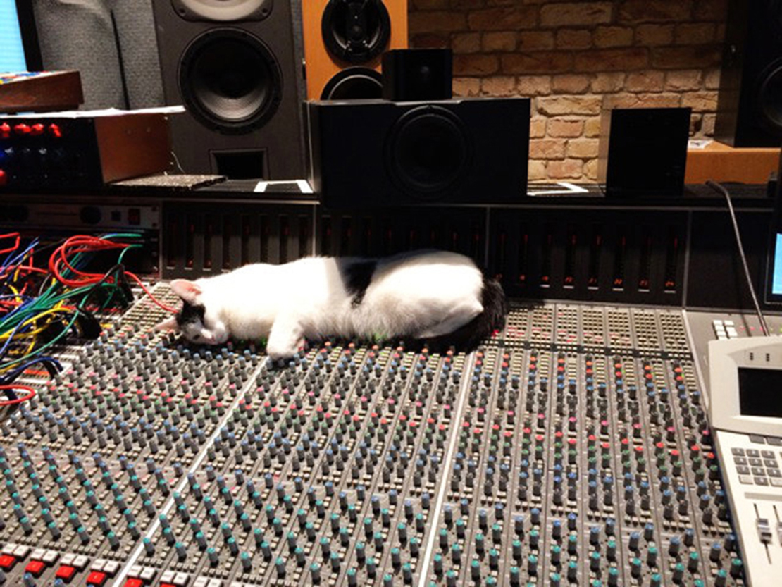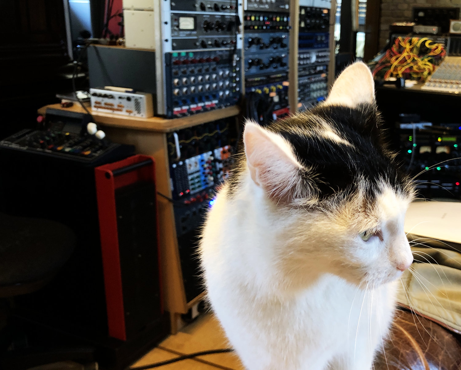 And while we're talking about iconic studio gear, note the red EMT250 reverb from 1972 behind the furry studio assistant, Lolita!